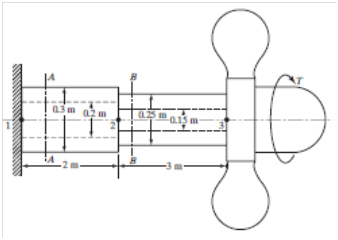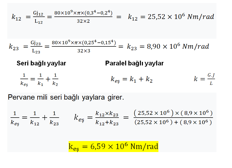 ÇÖZÜM: Milin 12 ve 23 segmentlerini birlikte yay olarak düşünmemiz gerekiyor. Şaftın herhangi bir enine kesitinde (AA veya BB gibi) indüklenen torkun, pervanede (T) uygulanan torka eşit olduğu görülebilir. İki bölüm 12 ve 23 seri yaylar olarak kabul edilir. Her parçanın yay katsayısını bulalım.