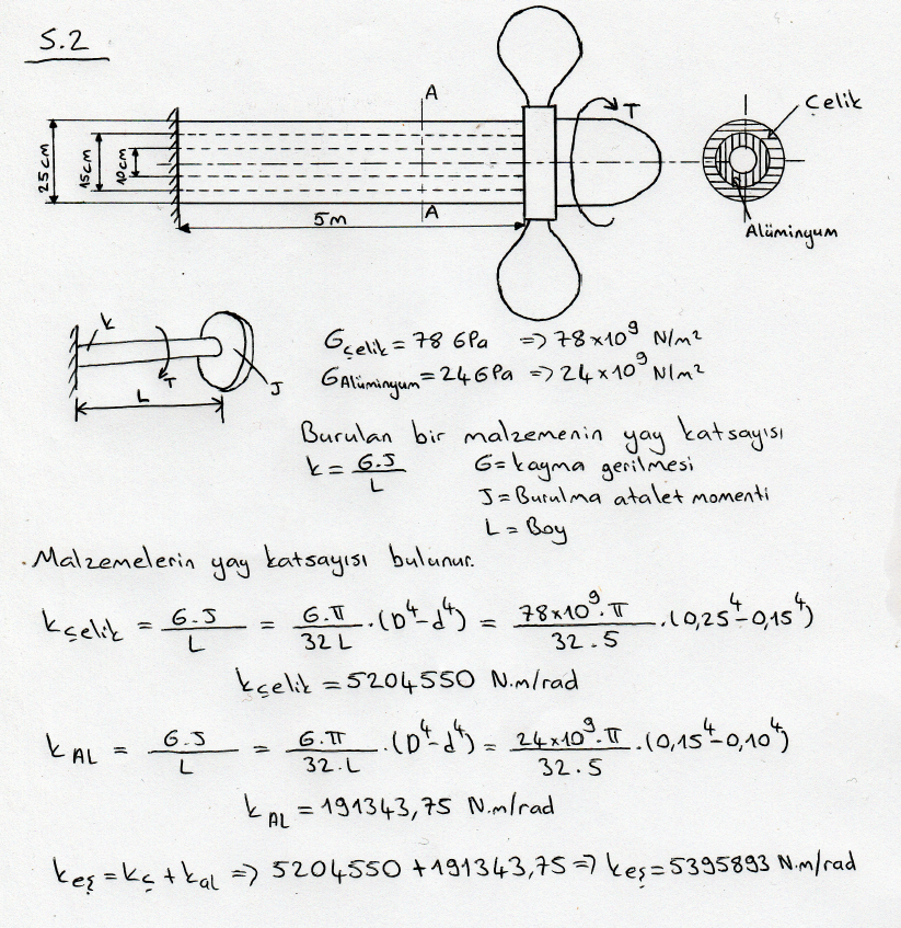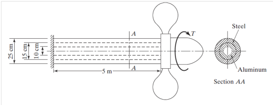 Alüminyum ve çelikten yapılan kompozit Pervane şahtı şekilde gösterilmiştir. şaftın eşdeğer burulma yay sabitinin bulunuz. Kayma modülleri Gçelik=78 GPa ve GAlüminyum=24 GPa