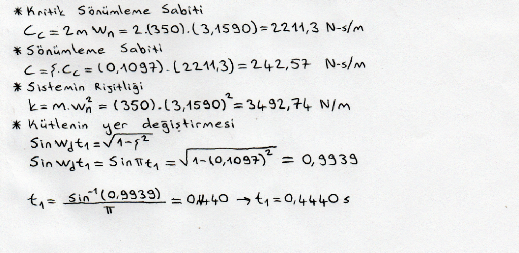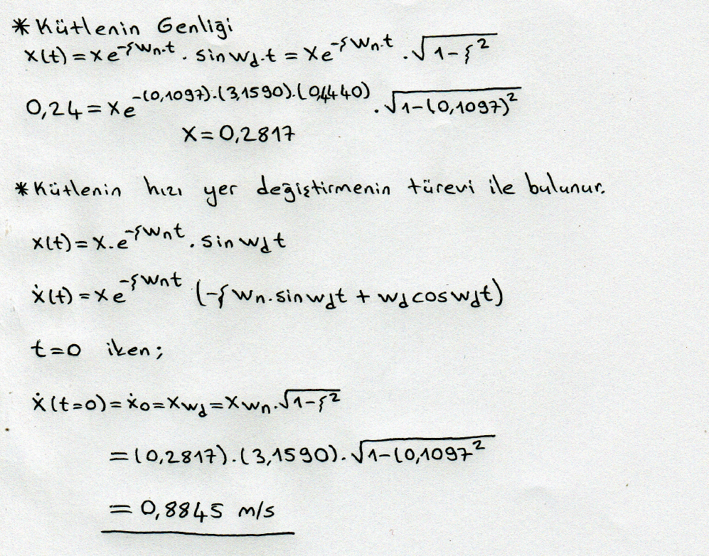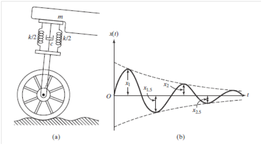 Bir araç zayıf sünümlü olarak tasarlanmış modeli Şekil a’da gösterilmiştir. Araç kütlesi 350 kg süspansiyon sistemi yol tümseğinden dolayı bir ilk kıza maruz kalır. yer değiştirme zaman eğrisi Şekil b de gösterilmiştir. Titreşimin sönümlü periyodu 2 s Yer değiştirme zamana göre x2=(x1)/2 olacak şekilde değişmektedir maksimum yer değiştirme 240 mm olması için minimum gerekli ilk hızı bulunuz.
