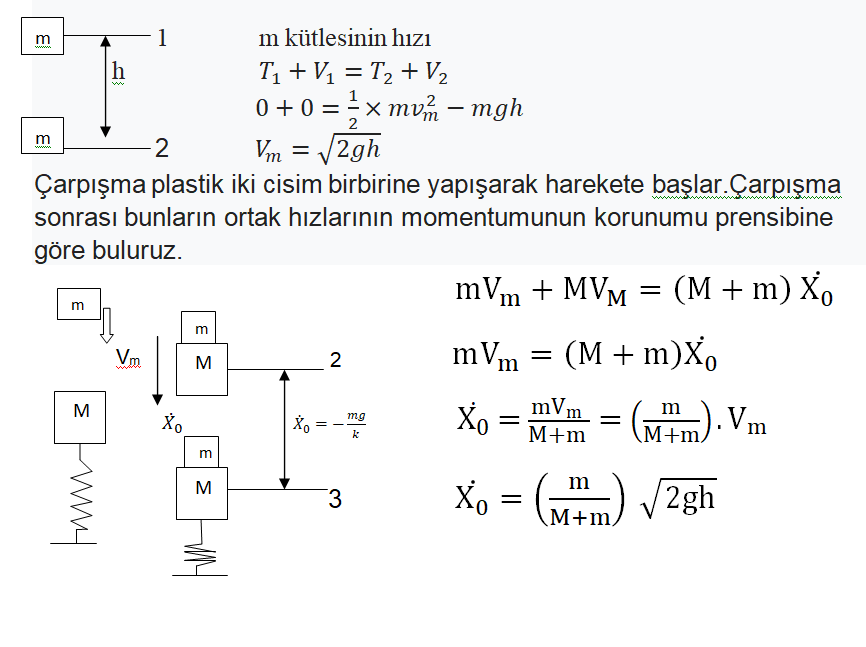 ÇÖZÜM: M kütlesi h yüksekliğinden düştüğünde M kütlesine bir hızda vuracaktır. Burada g yerçekimine bağlı ivmedir. Enerjinin korunumu prensibine göre bulunur.