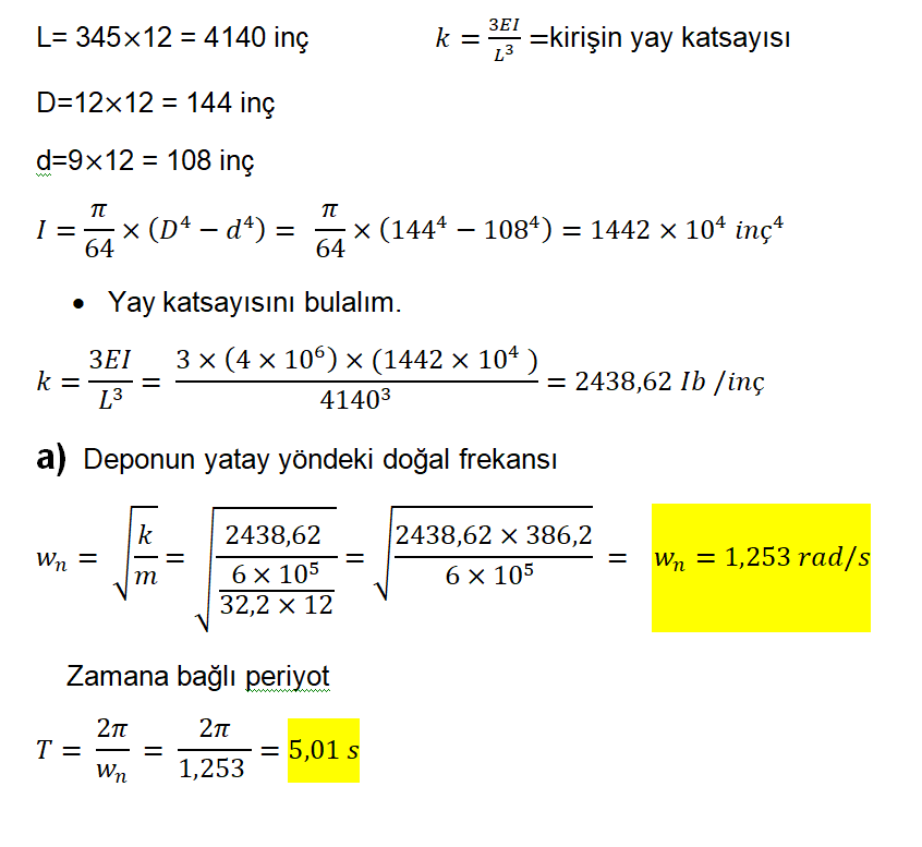 Su tankının sütunu 345 feet yüksekliğindedir. iç çapı 9 feet ve dış çapı 12 feet olan borusal iç kesite sahip takviyeli betondan malüldür tank su dolu iken ağırlığı 6×105 lb kütlesini ihmal ederek ve takviyeli betonun modülü 4 x 106 psi dir.